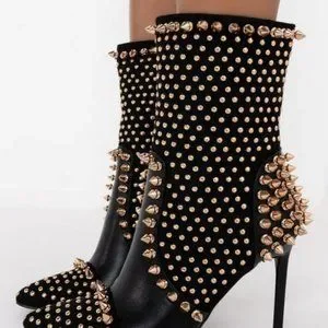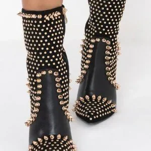 The AZALEA WANG Dancin With The Spiked Devil Stiletto Bootie in Black is an ultra-luxe mid calf high boot featuring a faux leather and suede upper, pointed toe silhouette, glossy stiletto heel, and tonal inner zipper closure. Complete with intricate studded detailing throughout.