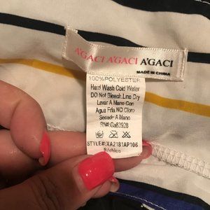 Size 8. Navy blue and gold stripes on white. Silky feeling polyester material. Two zippered pockets. Elastic waist. GUC. Small spots on front left (see pic).