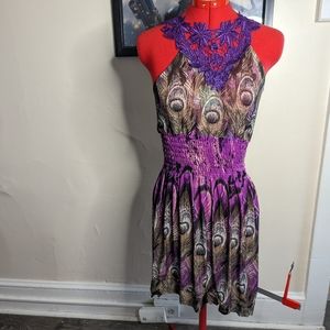 This dress is super soft and stretchy. It features a lace neckline and a deep v back. The middle is ruched and cinched, creating a lovely shape. It doesn't have any tags.