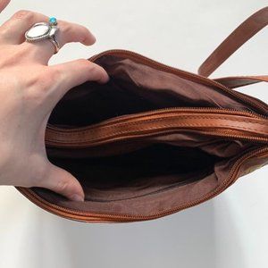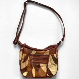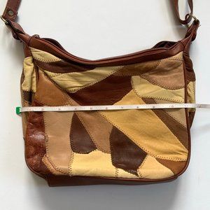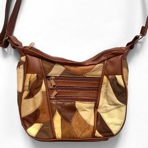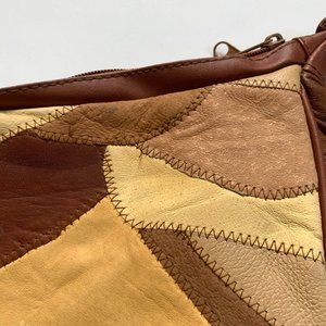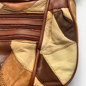 Multicolored brown patchwork leather shoulder bag. Three zippered pockets on the outside and separated interior pockets. Adjustable strap to make it a shoulder bag or a crossbody. Such a cool retro 70s look. Measures 11 inches across and 7.5 inches tall. There is some wear on the leather, but it gives it a really cool worn in vibe.