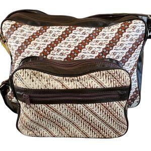 Proyek Rehabilitasi Bethesda was started 11/16/1982 and became Proyek Rehabilitasi Yakkum in 1991. These bags were produced between 1982 and 1991. Producers were clients receiving services at center, physically disabled young adults. The Leather used is either sheep or goat skin tanned in Yogyakarta. The white leather is silkscreened with traditional Indonesian batik designs.