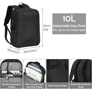 Airline Approved Backpack. 38L large backpack is 13.8 X 7.9 X 21.2 inches (35 X 20 X 54 cm); 10L removable daypack is 10.2 X 3.9 X 13.8 inches (26 X 10 X 35 cm). Both backpacks can fit the allowed maximum size of an IATA flights in the overhead compartment as well as the under seat storage.