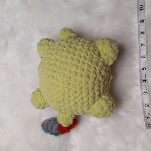 New Handmade Lime Frog Holding a Knife. Measurements are photographed. Sweet Snuggles by Loope & Threads for the knife and cheeks. Thin Bernat yarn for the frog and eyes. Bundle with another item for a personal bundle and shipping discount. Knife is floppy. (If you think this is a peculiar thing to make it was originally a Christmas commission that she never wanted) Smoke free home. Be Gentle. DO NOT WASH !!
