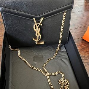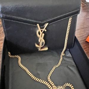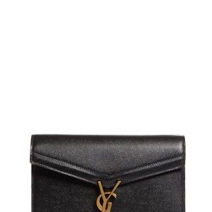 A pivoting monogram clasp adds heritage polish to this envelope wallet made from calfskin leather embossed to mimic the texture of grain de poudre. A removable chain strap gives you the option to carry it as an elegant evening bag.