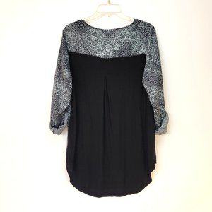 A pretty pullover top that has a softy, silky printed polyester front and sleeves with a black jersey knit back.