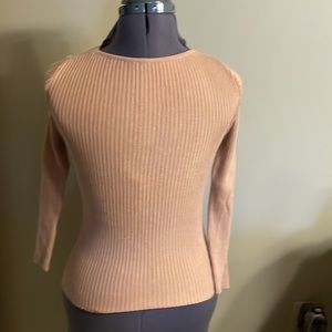 Tan colored ribbed, long sleeve sweater. Size is large, but fits like a medium. 50% Viscose/ 20% Nylon/ 30% Polyester Excellent Condition