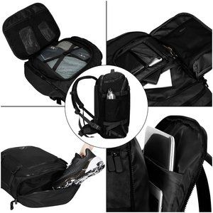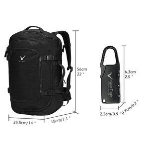 Airline Approved Carry on Backpack. The 45L backpack is 21.7 x 13.8 x 9 inches/ 55 x 35 x 23 cm and 3.4 lbs / 1.56 kg. It is able to fit the allowed maximum size of an IATA flights in the overhead compartment as well as the under seat storage.