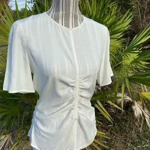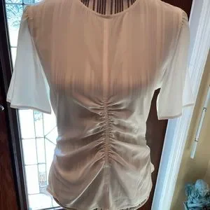 Gorgeous very classy,feminine &light weight. 100% silk. Touching in the front,sides & back. Upper part of blouse has 3 buttons along with a zipper showing a sexy peep hole in the back. NWOT Off white in color which makes it great for any outfit. Measures approx 18” across(36”) 22 1/2” long 10” short sleeve 1st & last photo is for display only a very similar blouse E15