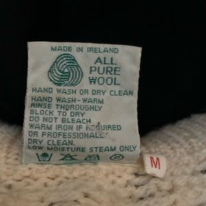 Features: woven leather buttons, pockets, long length and roomy fit. Real Made in Ireland off-white Aran sheepswool cable knit sweater. Let me know if you have any questions.