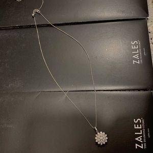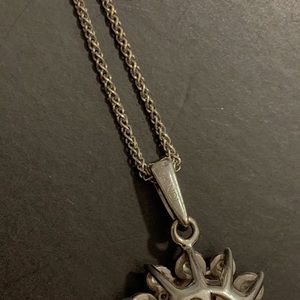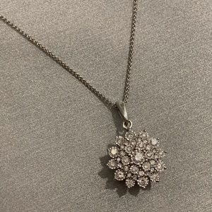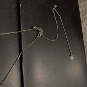 The necklace is set in 10k white gold, it is so pretty and brings in so many compliments. I didn’t like the chain that came with it, so I bought a 14k white gold adjustable chain. You can move it to whatever length you like with your outfit. I am pricing this according to both pieces. If you would like one piece and not the other, I can do that for sure. I have kept up with the diamond bond, getting the inspection and cleanings every 6 months.