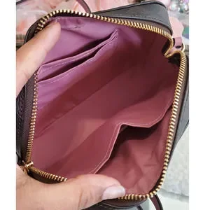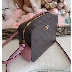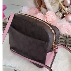 Beautiful Coach Mini Camera Crossbody in Signature Canvas Brown with pink