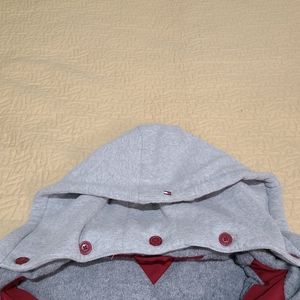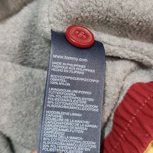 Vintage Tommy Hilfiger full front zip jacket. Red with Grey removable hoodie and 2 front pockets and large logo on the sleeve. Size L, in excellent used condition.