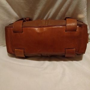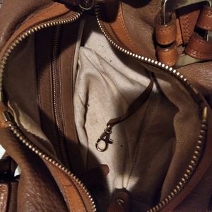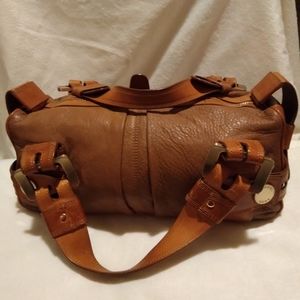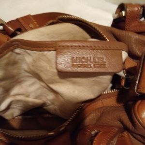 Michael Kors Brown Tan leather handbag. good used condition, has normal signs of wear. lining has normal wear. no major scratches, tears,holes or scuffs. Approx. L13.5"xW5.5"H5.5". strap is Approx. 17". pre owned.