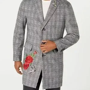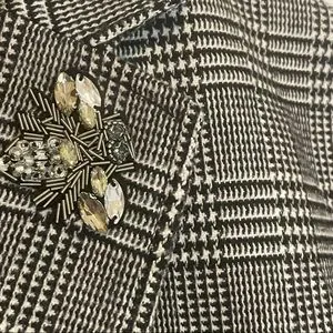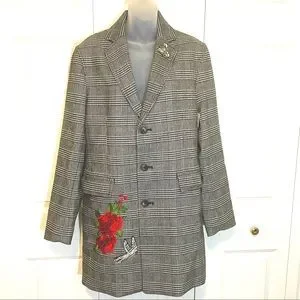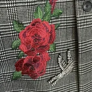INC Glen Plaid Pea Coat Black White Embellished Small Rose Embroidery