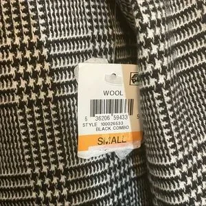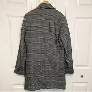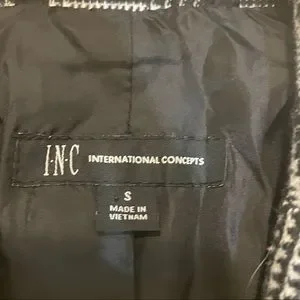 INC Glen Plaid Pea Coat Black White Embellished Small. Black Combo. Style 100026533. Unisex mens or womens B&W glen plaid pattern overcoat jacket, lined, buttons at sleeves and single breasted closure, front pockets, red rose embroidery, rhinestone beaded bird and bug insect bee embellishment.