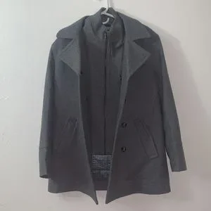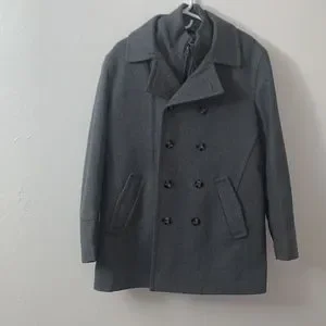 With its double-breasted closure and oversized notch collar, this heavyweight wool-blend peacoat is the ideal cold-weather companion. Styled with a removable bib, it also features a quilted interior lining for added comfort and warmth.