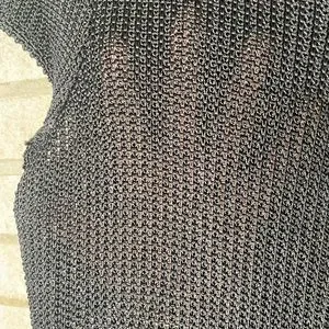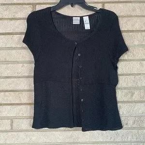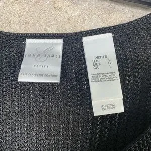 Black. Knitted design. All button in tack. No rips or stains. Size large petite. Can see through material