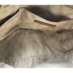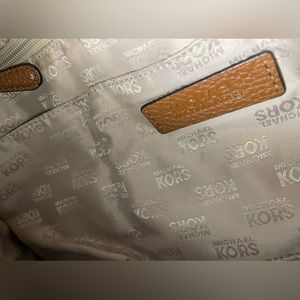 Michael Kors Cognac Pebbled Leather Zipper Top Shoulder Bag; Beige Jacquard Signature Polyester Lining; 3 Slip Pockets; Open Pocket; Zipper Pocket; Designer Patch; Gold Hardware w Designer Monogram on 1 Corner Ring; Matching Handle Strap; D Rings for a Shoulder Strap but no Shoulder Strap; GUC