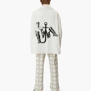 This jacket is part of the second capsule collection between Tom of Finland and J. W. Anderson in 2021 after the success of the first in 2020. Long sleeve cotton canvas jacket in off-white. Buttonhole at notched lapel collar. Double-breasted button closure at front with large woven leather buttons. Welt and patch pockets at waist. Logo and graphic embroidered in black at back. Welt pockets at interior. Fully lined. White hardware. Contrast stitching in black. Supplier color: White