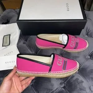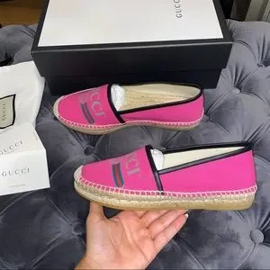 New with box, with dustbags. Women’s size 37.5. Gucci canvas espadrilles. In the color pink. Has the logo across the foot.