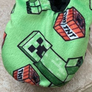 Green slippers featuring black and green creepers with red TNT blocks print