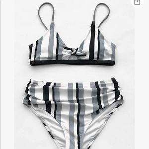 Design: Striped and Cutout Bikini Top with Bowknot. High Waisted Bikini Bottoms with Tummy Control Design. About Cup Style: with Removable Padded Cups