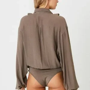 Semi-sheer fabric with ruffle trim. Front Mother of pearl button closure. Buttoned cuffs. Bottom snap button closure. Made in USA. Brand new in tags