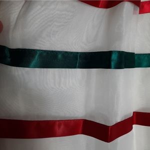 Has a snag in the green ribbon and has a couple of stains in underlining. Stain are not visible during wear. See last 2 photos for details.