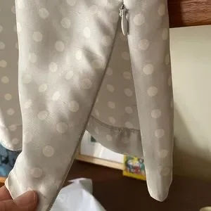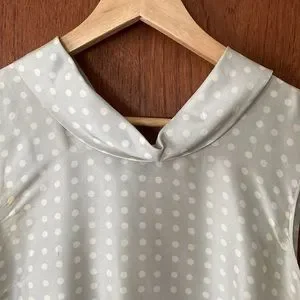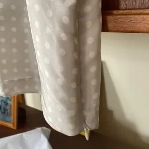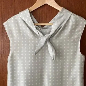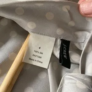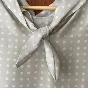 J Crew shantung silk retro scoop neck sleeveless bow tie shirt. Very Jackie O style. Beautiful, soft and timeless shirt. The bow tie is on the back, but you can wear it on front. Side zip on the left hand side allows easy wear. The color is light grey. Stain on arm pit area, but could be removed during dry cleaning. Loose thread at bottom but could easily be sewn back. Comment with any questions before purchasing. No returns.