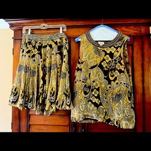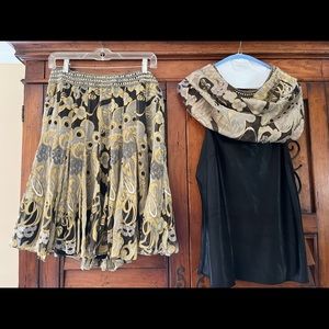 Fun skirt dress combo. Flowing skirt. Top has attached black camisole. Metallic finish