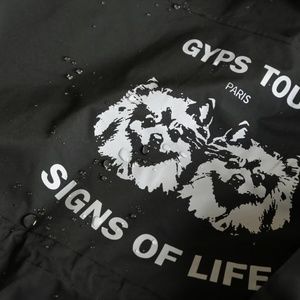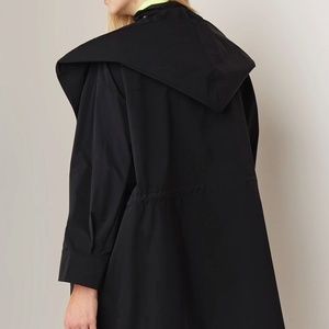 It is in water-repellent technical material. Removable hood and storm flap at the shoulders, stand-up collar and long sleeves. You can also make a bow tie using the storm flap and hood like the picture shows, which is cute. This is a great parka, and I never used it although no tag. Europe 1, S in US size