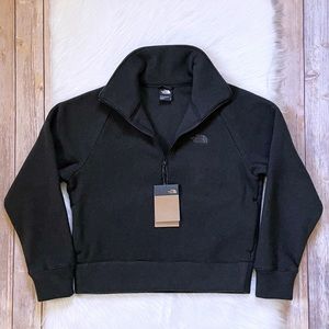 New With Tags- The North Face Women’s City Standard Microfleece 1/4 Zip Cropped Pullover In TNF Black Heather With Tall Stand Collar, Logo Embroidery At Left Chest And Zippered Hand Pockets.