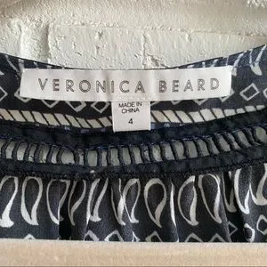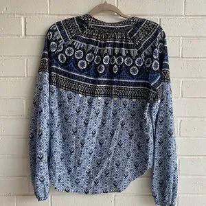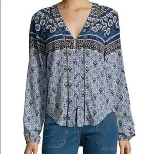 Veronica Beard V Neck Boho Blouse. French blue and crimson blouse featuring a mixed boho print and billowed shaped sleeves; V-neckline, long sleeves with elastic cuffs; button-up front;lace insets; shirttail hem; relaxed fit. 100% silk. Sold out