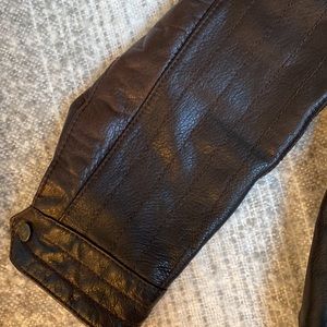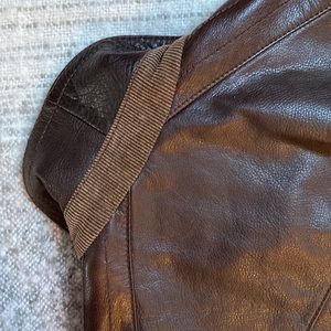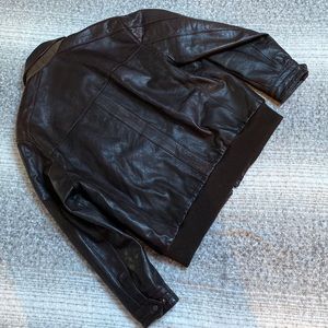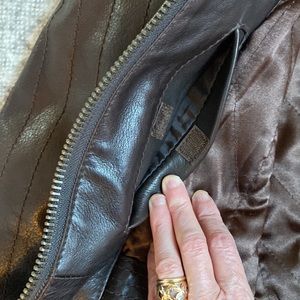 Leather jacket zip front, snap wrists, slash zip outer pockets, slash Velcro-close inner pockets, warm quilted lining with tweed fabric at the lining bottom, knit waist/hip border for shape. Dark chocolate brown. Lightly worn, I can see no flaws. Slight pilling on the lining appears to be picked up from a sweater worn underneath.