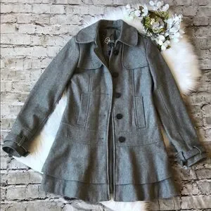 Beautiful flared peacoat by Guess. The drop waist & tiered flare details make this coat so flattering & unique! Single breasted w/ beautiful dark logo buttons & subtle gray satin lining. Charcoal Gray. Black/gunmetal button. Approximate measurements 18.5” pit to pit, 31.5" shoulder to hem, 25” sleeve.