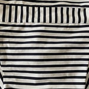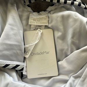 One piece metallic silver and navy blue striped swimsuit featuring a torso cutout, padded cups and lacing in the back. Fully lined, machine washable. 77% nylon; 15% metallic fibers; 8% spandex.