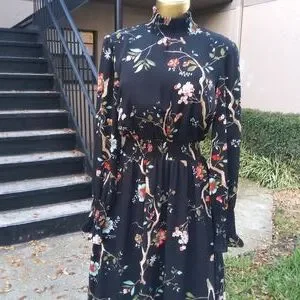 Those beautiful dress not only is it floral print it has the branches to prove it its Long-sleeved , Hi/low, a smock neck line, , 3 buttons at the Neck Machine wash NO BLEACH 100% POLYESTER Elastic waist line SIZE 4