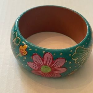Lacquered painted wood bracelet. Bohemian style. Very good condition. Turquoise green colored with flowers.8 in diameter.