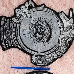 This tattoo hands w crystal ball patch is fully embroidered and big AF! 14 inches long by 11 inches wide, this piece will take up an entire jacket back! Too beautiful to be believed! Takes it breath away! This one is a HUGE seller! (shown in bottom pics on an L calvin Klein jean jacket... that is my chilling adventures of a hell witch jacket and will have it available on here, my etsy, my rage against the sewing machine FB page, and (if it doesnt sale online...) at festivals in Birmingham this coming spring!)