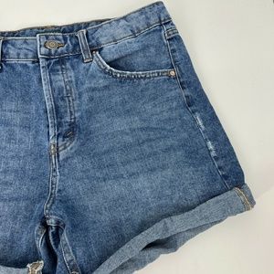 Wild Fable Denim Shorts Womens Size 12 Blue Jean High Rise Bermuda Distressed. Good condition. Center front zipper and button closure. Front/back pockets.