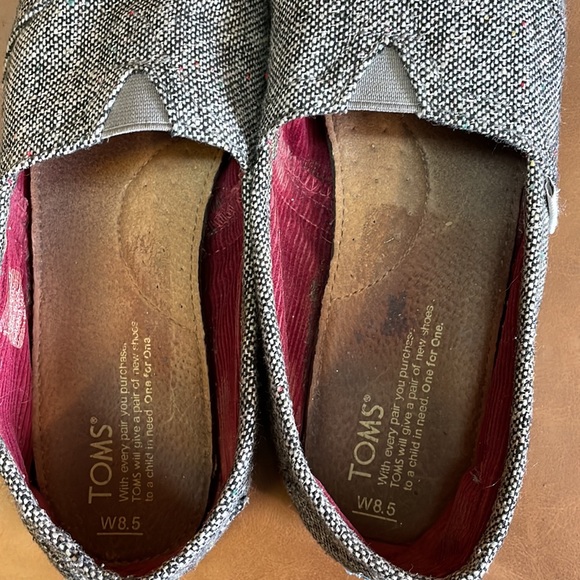 Women’s Tom’s size 8.5 in a black and white woven material with flecks of colors and silver. In good used condition.