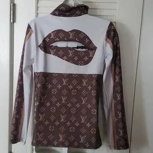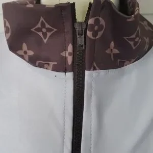 Cute jacket brown, white and tan. front zipper closure back design has lips. XS-S in size it does have some stretch. It has a few minor blemishes see photos 4/6/7. They do not effect the jacket. (AS IS PURCHASE)