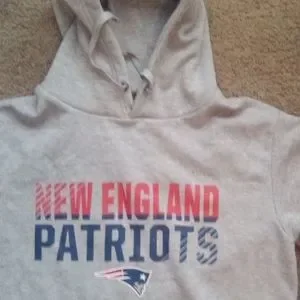 New England Patriots NFL football Man pullover sweatshirt is in good condition pre-owned hoodie with pockets. size is m and the color is gray. the material is 25% cotton and 25% polyester. with pocket in the front.