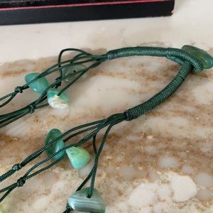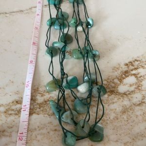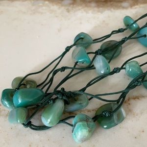 This lovely vintage necklace is from my personal collection. This has lovely polished green agate stones strung on a silk (I believe) thick thread. This was a gift years ago and has been stored in my jewelry box. Let me know if you have any questions.