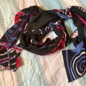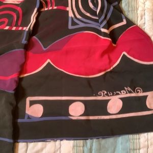 Lovely and so exciting to see. Vintage Michelle Marcuse scarf, thick silk crepe, of black blue, burgundy and fuschia with white detail. Abstract wonder. Double sided.