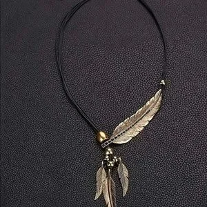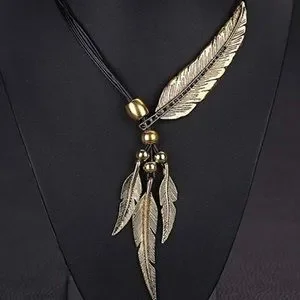 Gold alloy feather rhinestone accent necklace leather lobster claw clasp , sweater chain, vneck