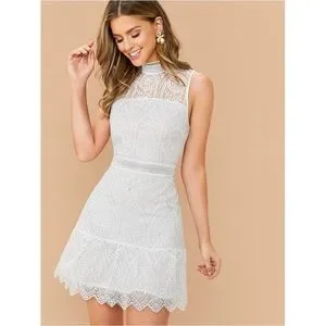 White Lace Dress Fit and Flared High Neck Embroidered Mesh