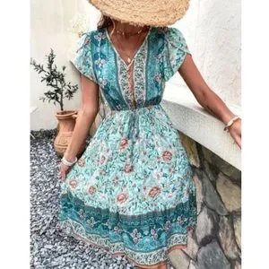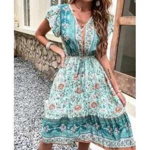 Boho floral print V neck ruffle hem dress