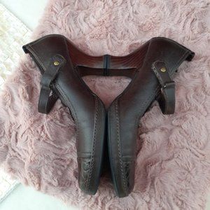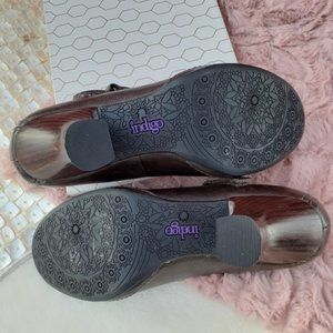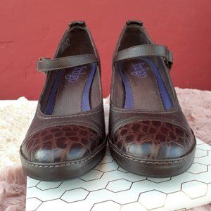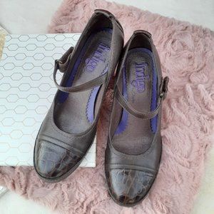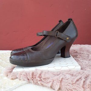 Stylish and chic Mary Jane pumps, the perfect all-season comfort shoe to take you from office career to weekend, to travel, vacation, party, and date night, don't miss these retro pin up heels from Indigo by Clarks! Ladies size 6; dark brown genuine leather upper; faux wood spool heel measures 2.75" tall; cushioned insole and non-skid outsole; hook & loop strap; moc croc cap toe & heels. New with my Boutique tags mint unworn condition.
