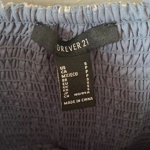 This is a strapless blue dress with a sweetheart neckline, princess cut waist with some boning, side zip closure and shirring on the back. The print is white and light pink.